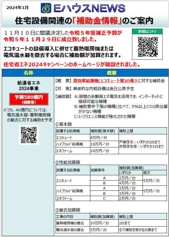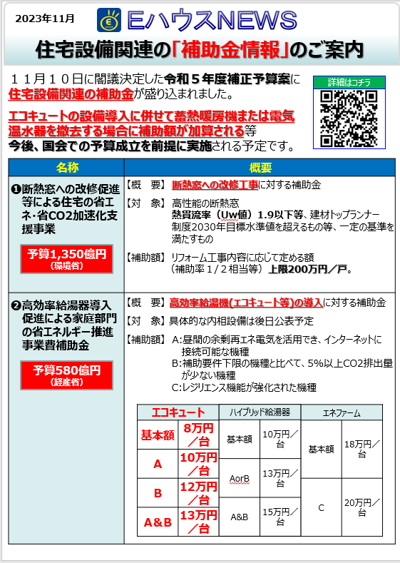 【EハウスNEWS】住宅設備関連の「補助金情報」のご案内